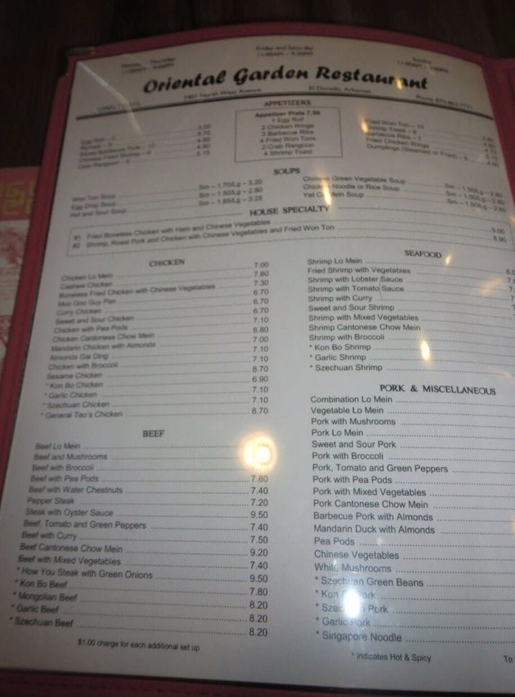 Located in El Dorado, AR, Oriental Gardens is a Chinese restaurant that offers a wide range of delicious dishes. With amenities like takeout, delivery, and cozy seating, this establishment caters to various preferences. Customers praise the generous portion sizes and delectable flavors of their meals. Despite the aging appearance of the restaurant, the food quality remains consistently top-notch. Standout items like the won ton soup and egg rolls have garnered rave reviews from patrons. Families, groups, and individuals alike can enjoy a satisfying dining experience at Oriental Gardens. Whether for lunch, dinner, or a special occasion, this spot is a local favorite for authentic oriental Chinese cuisine. Consider giving this hidden gem a try and indulge in a memorable culinary adventure.